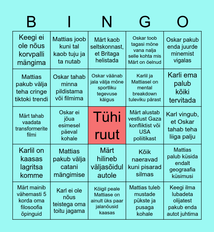 This bingo card has a free space and 24 words: Mattias pakub välja catani mängimise, Karl ei ole nõus teistega oma toitu jagama, Oskar väänab jala välja mõne sportliku tegevuse käigus, Märt mainib vähemasti 5 korda oma filosoofia õpinguid, Oskar pakub enda juurde minemist vigalas, Keegi ei ole nõus korvpalli mängima, Mattias pakub välja teha cringe tiktoki trendi, Mattias joob kuni tal kaob tuju ja ta nutab, Märt alustab vestlust Gaza konfliktist või USA poliitikast, Märt hilineb väljasõidul autole, Karlil ja Mattiasel on mental breakdown tuleviku pärast, Märt tahab vaadata transformerite filmi, Kõik naeravad kuni pisarad silmas, Mattias palub küsida endalt geograafia küsimusi, Oskar tahab minna pildistama või filmima, Mattias tuleb mustade pükste ja pusaga kohale, Karl vingub, et Oskar tahab teha liiga palju, Märt kaob seltskonnast, et Britaga helistada, Karli ema palub kõiki tervitada, Oskar ei jõua esimesel päeval kohale, Keegi ilma lubadeta olijatest pakub enda autot juhtima, Karlil on kaasas lagritsa komme, Oskar toob tagasi mõne vana nalja selle kohta mis Märt on öelnud and Kõigil peale Mattiase on ainult üks paar jalanõusid kaasas.