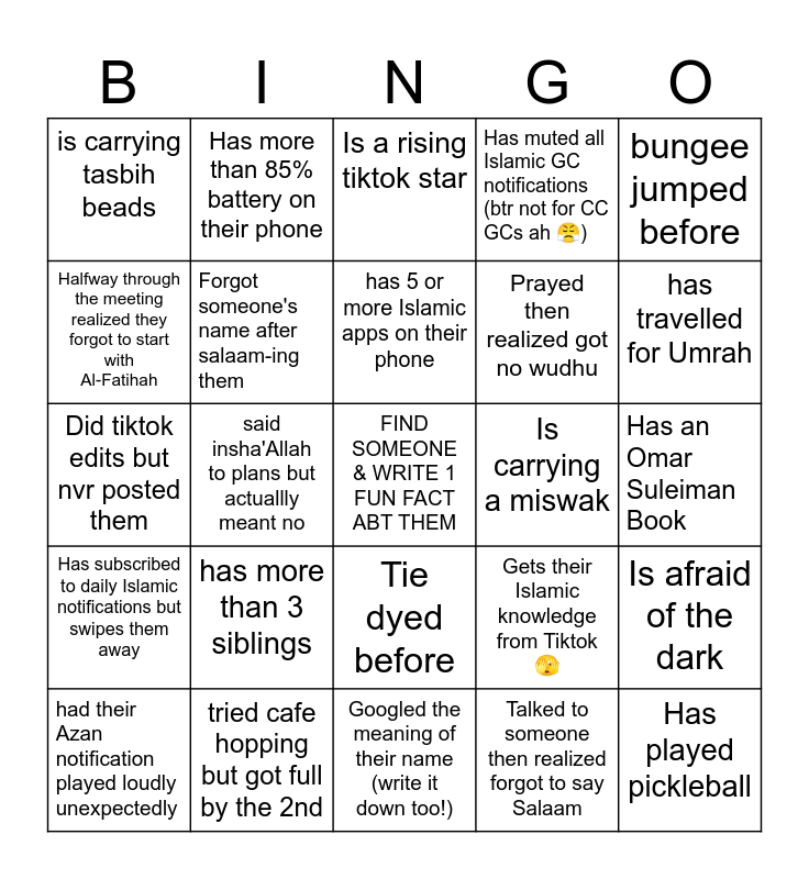 This bingo card has a free space and 24 words: has more than 3 siblings, tried cafe hopping but got full by the 2nd, has 5 or more Islamic apps on their phone, had their Azan notification played loudly unexpectedly, bungee jumped before, is carrying tasbih beads, Halfway through the meeting realized they forgot to start with Al-Fatihah, Has more than 85% battery on their phone, Is carrying a miswak, Tie dyed before, Prayed then realized got no wudhu, Did tiktok edits but nvr posted them, Gets their Islamic knowledge from Tiktok 🫣, Is afraid of the dark, Forgot someone's name after salaam-ing them, Talked to someone then realized forgot to say Salaam, Has an Omar Suleiman Book, Is a rising tiktok star, has travelled for Umrah, said insha'Allah to plans but actuallly meant no, Has played pickleball, Has subscribed to daily Islamic notifications but swipes them away, Has muted all Islamic GC notifications (btr not for CC GCs ah 😤) and Googled the meaning of their name (write it down too!).