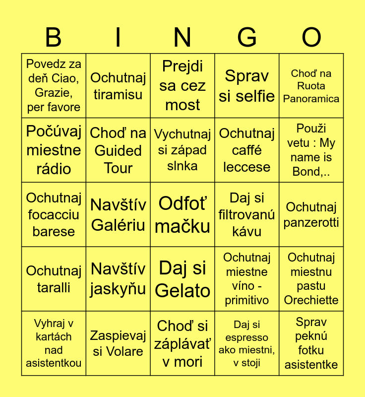 This bingo card has a free space and 24 words: Navštív jaskyňu, Zaspievaj si Volare, Vychutnaj si západ slnka, Vyhraj v kartách nad asistentkou, Choď na Ruota Panoramica, Povedz za deň Ciao, Grazie, per favore, Počúvaj miestne rádio, Ochutnaj tiramisu, Daj si filtrovanú kávu, Daj si Gelato, Ochutnaj caffé leccese, Ochutnaj focacciu barese, Ochutnaj miestne víno - primitivo, Ochutnaj miestnu pastu Orechiette, Choď na Guided Tour, Daj si espresso ako miestni, v stoji, Ochutnaj panzerotti, Prejdi sa cez most, Použi vetu : My name is Bond,.., Navštív Galériu, Sprav peknú fotku asistentke, Ochutnaj taralli, Sprav si selfie and Choď si záplávať v mori.