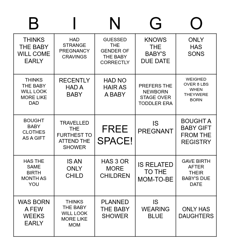 This bingo card has a free space and 24 words: IS AN ONLY CHILD, THINKS THE BABY WILL LOOK MORE LIKE MOM, HAD NO HAIR AS A BABY, WAS BORN A FEW WEEKS EARLY, ONLY HAS SONS, THINKS THE BABY WILL COME EARLY, THINKS THE BABY WILL LOOK MORE LIKE DAD, HAD STRANGE PREGNANCY CRAVINGS, IS PREGNANT, HAS 3 OR MORE CHILDREN, PREFERS THE NEWBORN STAGE OVER TODDLER ERA, BOUGHT BABY CLOTHES AS A GIFT, IS RELATED TO THE MOM-TO-BE, GAVE BIRTH AFTER THEIR BABY'S DUE DATE, RECENTLY HAD A BABY, IS WEARING BLUE, BOUGHT A BABY GIFT FROM THE REGISTRY, GUESSED THE GENDER OF THE BABY CORRECTLY, WEIGHED OVER 8 LBS WHEN THEYWERE BORN, TRAVELLED THE FURTHEST TO ATTEND THE SHOWER, ONLY HAS DAUGHTERS, HAS THE SAME BIRTH MONTH AS YOU, KNOWS THE BABY'S DUE DATE and PLANNED THE BABY SHOWER.