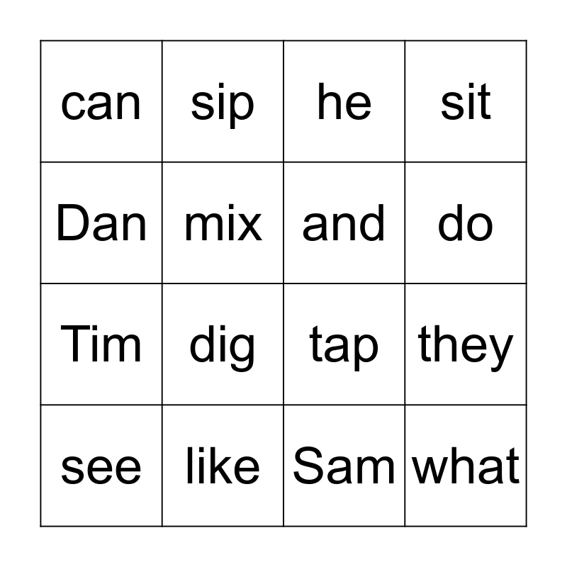 This bingo card has a free space and 15 words: see, what, he, can, do, Dan, dig, Sam, mix, Tim, they, sit, and, sip and like.
