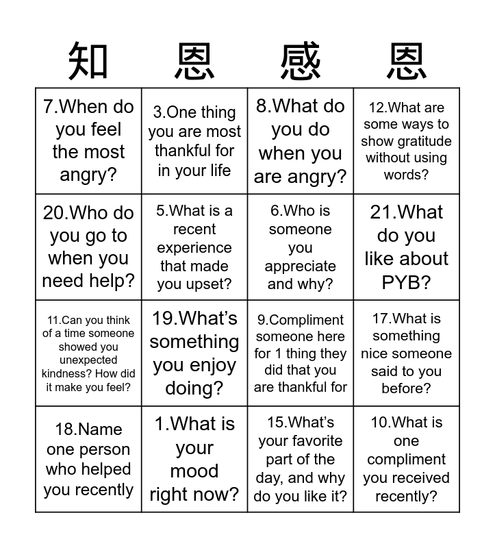 This bingo card has 22 words: 1.What is your mood right now?, 2.What is something you are grateful for today?, 3.One thing you are most thankful for in your life, 4.What is a recent experience that made you smile or laugh?, 5.What is a recent experience that made you upset?, 6.Who is someone you appreciate and why?, 7.When do you feel the most angry?, 8.What do you do when you are angry?, 9.Compliment someone here for 1 thing they did that you are thankful for, 10.What is one compliment you received recently?, 11.Can you think of a time someone showed you unexpected kindness? How did it make you feel?, 12.What are some ways to show gratitude without using words?, 13.What’s something you’re grateful for that money can’t buy?, 14.How do you show appreciation to your friends or family?, 15.What’s your favorite part of the day, and why do you like it?, 16.What is something fun you did recently that you're thankful for?, 17.What is something nice someone said to you before?, 18.Name one person who helped you recently, 19.What’s something you enjoy doing?, 20.Who do you go to when you need help?, 21.What do you like about PYB? and 22.What is something you regret?.