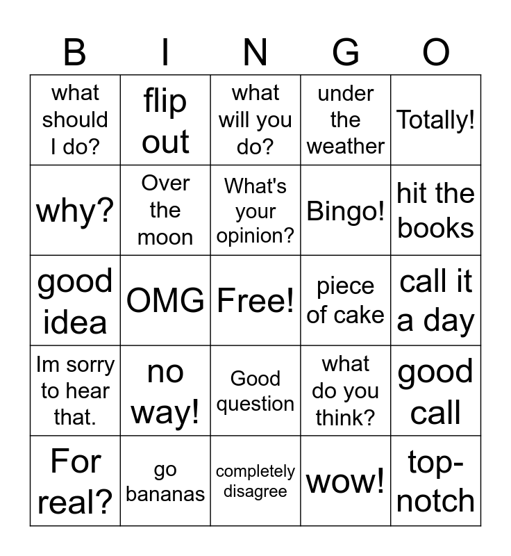 This bingo card has a free space and 24 words: no way!, go bananas, What's your opinion?, For real?, Totally!, what should I do?, why?, flip out, piece of cake, Good question, Bingo!, good idea, what do you think?, good call, Over the moon, wow!, call it a day, what will you do?, hit the books, OMG, top-notch, Im sorry to hear that., under the weather and completely disagree.