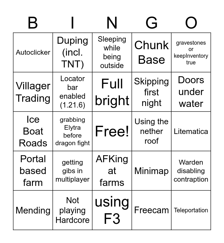 This bingo card has a free space and 24 words: getting gibs in multiplayer, Not playing Hardcore, Full bright, Mending, gravestones or keepInventory true, Autoclicker, Villager Trading, Duping (incl. TNT), Using the nether roof, AFKing at farms, Skipping first night, Ice Boat Roads, Minimap, Warden disabling contraption, Locator bar enabled (1.21.6), Freecam, Litematica, Sleeping while being outside, Doors under water, grabbing Elytra before dragon fight, Teleportation, Portal based farm, Chunk Base and using F3.