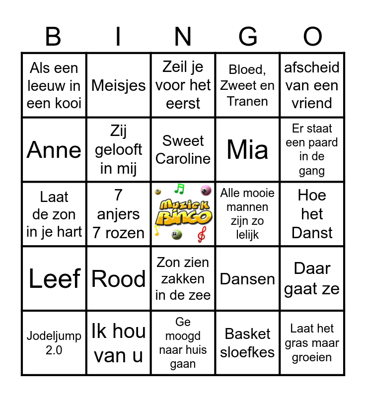 This bingo card has a free space and 33 words: Ik wil je, Lieve Kleine Piranha, Sweet Caroline, Dancing Queen, Hoe het Danst, Als een leeuw in een kooi, Zij gelooft in mij, Ge moogd naar huis gaan, Mia, Laat het gras maar groeien, Anne, Meisjes, Basket sloefkes, Viva de romeo's, Laat de zon in je hart, 7 anjers 7 rozen, Zon zien zakken in de zee, Dansen, Daar gaat ze, Leef, Ik hou van u, De Marie Louise, Bloed, Zweet en Tranen, Er staat een paard in de gang, Vonken & vuur, Rood, Zeil je voor het eerst, Alle mooie mannen zijn zo lelijk, afscheid van een vriend, Jodeljump 2.0, Master of puppets, Freak On a Leash and In Da Club.
