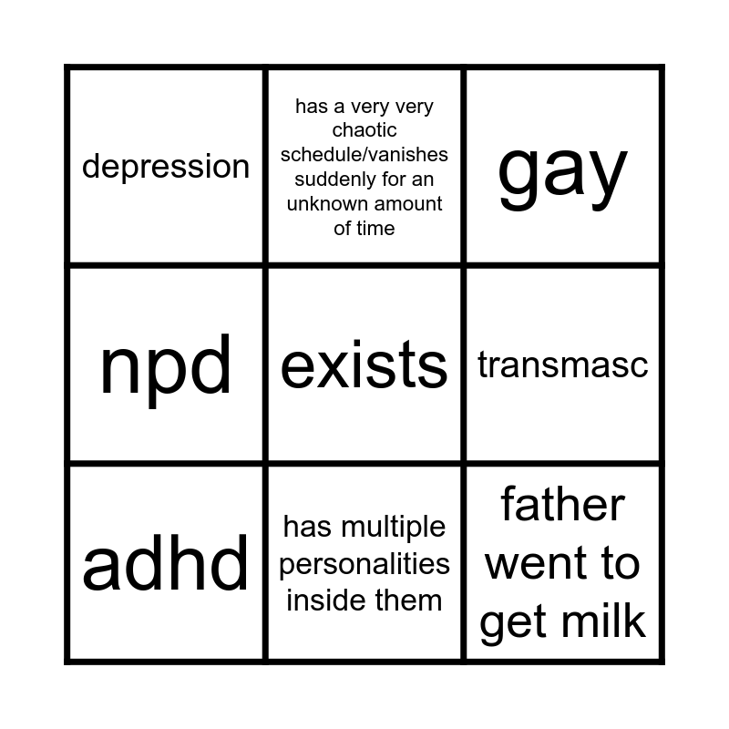 This bingo card has a free space and 8 words: npd, has a very very chaotic schedule/vanishes suddenly for an unknown amount of time, transmasc, adhd, gay, depression, has multiple personalities inside them and father went to get milk.