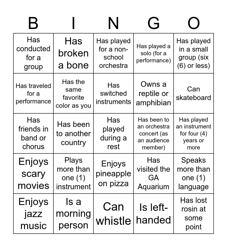 This bingo card has a free space and 24 words: Plays more than one (1) instrument, Is a morning person, Has switched instruments, Enjoys jazz music, Has played in a small group (six (6) or less), Has conducted for a group, Has traveled for a performance, Has broken a bone, Has been to an orchestra concert (as an audience member), Enjoys pineapple on pizza, Owns a reptile or amphibian, Has friends in band or chorus, Has visited the GA Aquarium, Speaks more than one (1) language, Has the same favorite color as you, Is left-handed, Has played an instrument for four (4) years or more, Has played for a non-school orchestra, Can skateboard, Has been to another country, Has lost rosin at some point, Enjoys scary movies, Has played a solo (for a performance) and Can whistle.