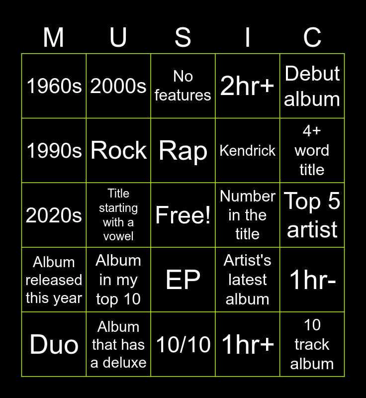 This bingo card has a free space and 42 words: One word title, Rap, Non rap, Album in my top 10, 1hr+, 1hr-, 10 track album, 10+ track album, No features, EP, Top 5 artist, 4+ word title, Title starting with a vowel, Debut album, Mixtape, Artist's latest album, Collab album, 2020s, 2010s, 2000s, 1990s, 1980s, 1970s, 1960s, Beach House, The Weeknd, Kendrick, Kanye, Peggy, 90+ on AOTY, Female artist, Album released this year, Rock, 10/10, Band, Duo, Album that has a deluxe, Number in the title, 30mins-, Released in leap year, 2hr+ and 0/10.