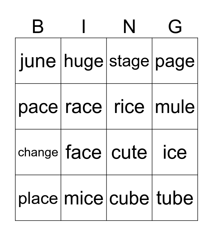 This bingo card has 16 words: mice, ice, stage, june, change, huge, cute, cube, pace, race, place, page, face, mule, rice and tube.