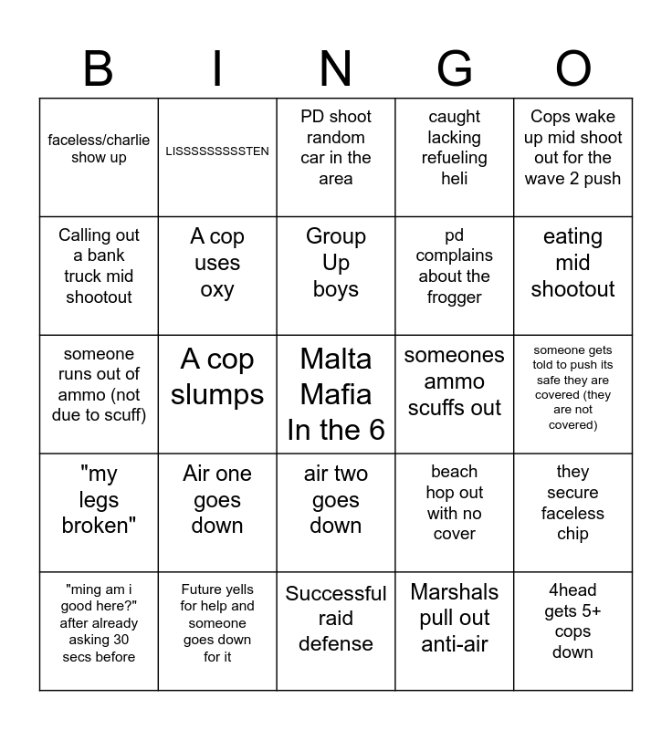This bingo card has a free space and 24 words: Air one goes down, Future yells for help and someone goes down for it, Group Up boys, "ming am i good here?" after already asking 30 secs before, Cops wake up mid shoot out for the wave 2 push, faceless/charlie show up, Calling out a bank truck mid shootout, LISSSSSSSSSTEN, someones ammo scuffs out, air two goes down, pd complains about the frogger, someone runs out of ammo (not due to scuff), beach hop out with no cover, they secure faceless chip, A cop uses oxy, Marshals pull out anti-air, someone gets told to push its safe they are covered (they are not covered), PD shoot random car in the area, eating mid shootout, A cop slumps, 4head gets 5+ cops down, "my legs broken", caught lacking refueling heli and Successful raid defense.