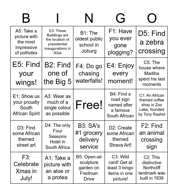 This bingo card has a free space and 30 words: A1: Take a picture with an aloe or a protea, A2: Run a favourite run in reverse, A3: Wear as much of a single colour as possible, A4: The oldest house left standing in Joburg, built by Charles Aburrow in 1897, A5: Take a picture with the most impressive of potholes, B1: The oldest public school in Joburg, B2: Find one of the Big 5, B3: SA's #1 grocery delivery service, B4: Find a road sign named after a famous South African, B5: Open-air sculpture garden on Fredman Drive, C1: An African themed coffee shop in Zoo Lake, founded by Tony Rashid, C2: This distinctive Northcliff landmark was built in 1939, C3: Wild card! Get at least 3 bingo items in one picture!, C4: The 14th of South Africa's National Botanical Gardens, C5: The house where Madiba spent his last moments, D1: Iconic granite structure in the South of Pretoria, opened in 1949, D2: Create some African themed Strava Art!, D3: Find some African themed street art, D4: The only Four Seasons Hotel in South Africa, D5: Find a zebra crossing, E1: Show us your proudly South African Spirit, E2: Find a penny, pick it up, and all day long you'll have good luck!, E3: These Buildings are the location of presidential inaugurations in RSA, E4: Enjoy every moment!, E5: Find your wings!, F1: Have you ever gone plogging?, F2: Find an animal crossing sign, F3: Celebrate Xmas in July!, F4: Do go chasing waterfalls! and F5: These are purely decorative during Load Shedding.