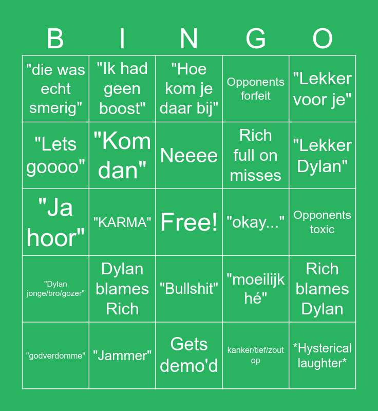 This bingo card has a free space and 24 words: "godverdomme", Dylan blames Rich, Neeee, kanker/tief/zout op, "Lekker voor je", "die was echt smerig", "Ik had geen boost", "Hoe kom je daar bij", "okay...", Opponents toxic, "Ja hoor", "Kom dan", "moeilijk hé", Rich blames Dylan, "Lets goooo", "Jammer", Gets demo'd, Opponents forfeit, "Lekker Dylan", "Dylan jonge/bro/gozer", "KARMA", "Bullshit", Rich full on misses and *Hysterical laughter*.