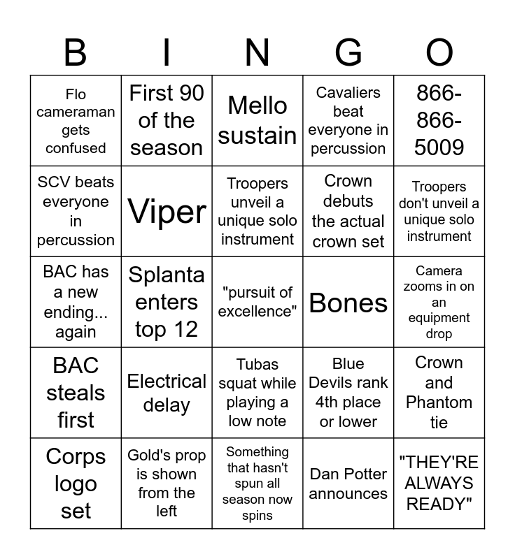 This bingo card has a free space and 24 words: Electrical delay, Gold's prop is shown from the left, Troopers unveil a unique solo instrument, Corps logo set, 866-866-5009, Flo cameraman gets confused, SCV beats everyone in percussion, First 90 of the season, Bones, Tubas squat while playing a low note, Crown debuts the actual crown set, BAC has a new ending... again, Blue Devils rank 4th place or lower, Crown and Phantom tie, Viper, Dan Potter announces, Camera zooms in on an equipment drop, Mello sustain, Troopers don't unveil a unique solo instrument, Splanta enters top 12, "THEY'RE ALWAYS READY", BAC steals first, Cavaliers beat everyone in percussion and Something that hasn't spun all season now spins.