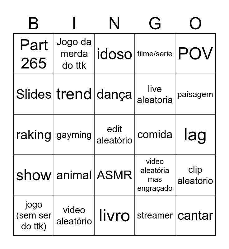 This bingo card has a free space and 24 words: animal, video aleatório, dança, jogo (sem ser do ttk), POV, Part 265, Slides, Jogo da merda do ttk, comida, ASMR, live aleatoria, raking, video aleatória mas engraçado, clip aleatorio, trend, streamer, lag, idoso, paisagem, gayming, cantar, show, filme/serie and livro.