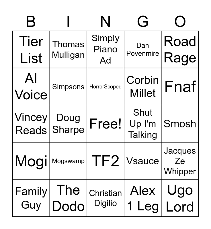 This bingo card has a free space and 39 words: Abram, SaucyTV, Ninjago, Simpsons, Family Guy, TF2, HorrorScoped, Blind Pete, Road Rage, Mogi, Doug Sharpe, Dan Povenmire, Ugo Lord, Smosh, Shut Up I'm Talking, Mogswamp, Lego New York, Tier List, Fingees, Vsauce, AI Voice, Christian Digilio, Corbin Millet, Fnaf, Big Beau, DDoI, IBXToyCat, Jaron, Derek Lipp, Thomas Mulligan, CaseOh, UFDTech, Simply Piano Ad, The Dodo, Alex 1 Leg, Half-Life, Jacques Ze Whipper, Vincey Reads and Don't Recommend this Channel.
