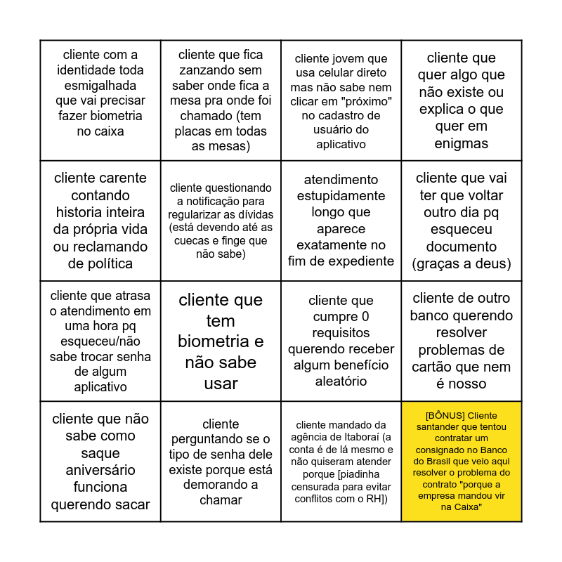 This bingo card has 16 words: cliente que não sabe como saque aniversário funciona querendo sacar, cliente perguntando se o tipo de senha dele existe porque está demorando a chamar, cliente jovem que usa celular direto mas não sabe nem clicar em "próximo" no cadastro de usuário do aplicativo, cliente que quer algo que não existe ou explica o que quer em enigmas, cliente carente contando historia inteira da própria vida ou reclamando de política, cliente que fica zanzando sem saber onde fica a mesa pra onde foi chamado (tem placas em todas as mesas), cliente que cumpre 0 requisitos querendo receber algum benefício aleatório, cliente de outro banco querendo resolver problemas de cartão que nem é nosso, cliente com a identidade toda esmigalhada que vai precisar fazer biometria no caixa, cliente questionando a notificação para regularizar as dívidas (está devendo até as cuecas e finge que não sabe), cliente mandado da agência de Itaboraí (a conta é de lá mesmo e não quiseram atender porque [piadinha censurada para evitar conflitos com o RH]), cliente que vai ter que voltar outro dia pq esqueceu documento (graças a deus), cliente que atrasa o atendimento em uma hora pq esqueceu/não sabe trocar senha de algum aplicativo, cliente que tem biometria e não sabe usar, atendimento estupidamente longo que aparece exatamente no fim de expediente and [BÔNUS] Cliente santander que tentou contratar um consignado no Banco do Brasil que veio aqui resolver o problema do contrato "porque a empresa mandou vir na Caixa".