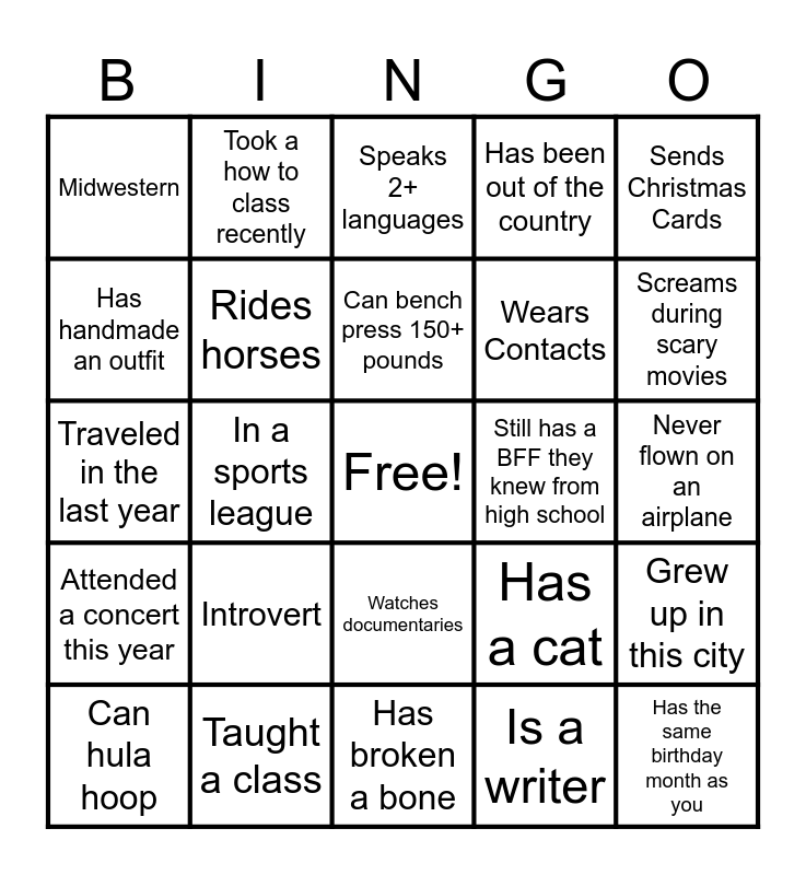 This bingo card has a free space and 24 words: Introvert, Taught a class, Can bench press 150+ pounds, Can hula hoop, Sends Christmas Cards, Midwestern, Has handmade an outfit, Took a how to class recently, Still has a BFF they knew from high school, Watches documentaries, Wears Contacts, Traveled in the last year, Has a cat, Grew up in this city, Rides horses, Is a writer, Never flown on an airplane, Speaks 2+ languages, Screams during scary movies, In a sports league, Has the same birthday month as you, Attended a concert this year, Has been out of the country and Has broken a bone.