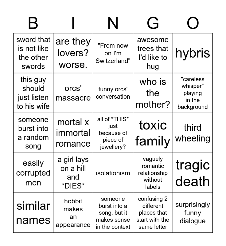 This bingo card has a free space and 24 words: a girl lays on a hill and *DIES*, hobbit makes an appearance, funny orcs' conversation, similar names, hybris, sword that is not like the other swords, this guy should just listen to his wife, are they lovers? worse., toxic family, isolationism, who is the mother?, someone burst into a random song, vaguely romantic relationship without labels, tragic death, orcs' massacre, confusing 2 different places that start with the same letter, third wheeling, "From now on I'm Switzerland", "careless whisper" playing in the background, mortal x immortal romance, surprisingly funny dialogue, easily corrupted men, awesome trees that I'd like to hug and someone burst into a song, but it makes sense in the context.