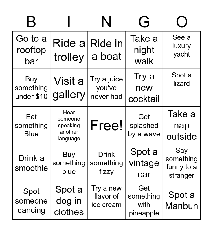 This bingo card has a free space and 24 words: Buy something blue, Spot a dog in clothes, Try a juice you've never had, Spot someone dancing, See a luxury yacht, Go to a rooftop bar, Buy something under $10, Ride a trolley, Get splashed by a wave, Drink something fizzy, Try a new cocktail, Eat something Blue, Spot a vintage car, Say something funny to a stranger, Visit a gallery, Get something with pineapple, Take a nap outside, Ride in a boat, Spot a lizard, Hear someone speaking another language, Spot a Manbun, Drink a smoothie, Take a night walk and Try a new flavor of ice cream.
