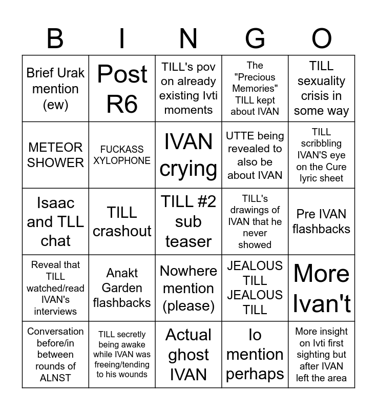 This bingo card has a free space and 24 words: Anakt Garden flashbacks, TILL secretly being awake while IVAN was freeing/tending to his wounds, IVAN crying, Conversation before/in between rounds of ALNST, TILL sexuality crisis in some way, Brief Urak mention (ew), METEOR SHOWER, Post R6, TILL's drawings of IVAN that he never showed, Nowhere mention (please), UTTE being revealed to also be about IVAN, Isaac and TLL chat, JEALOUS TILL JEALOUS TILL, More Ivan't, FUCKASS XYLOPHONE, Io mention perhaps, Pre IVAN flashbacks, TILL's pov on already existing Ivti moments, TILL scribbling IVAN'S eye on the Cure lyric sheet, TILL crashout, More insight on Ivti first sighting but after IVAN left the area, Reveal that TILL watched/read IVAN's interviews, The "Precious Memories" TILL kept about IVAN and Actual ghost IVAN.