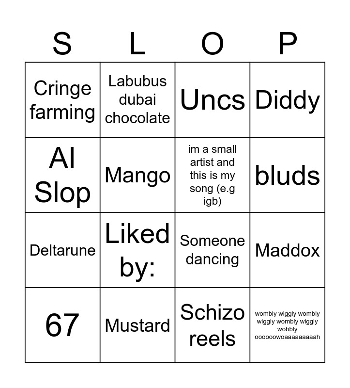 This bingo card has 16 words: Mustard, Maddox, Uncs, Cringe farming, Deltarune, Labubus dubai chocolate, Someone dancing, Schizo reels, AI Slop, Mango, 67, Diddy, Liked by:, bluds, im a small artist and this is my song (e.g igb) and wombly wiggly wombly wiggly wombly wiggly wobbly oooooowoaaaaaaaaah.