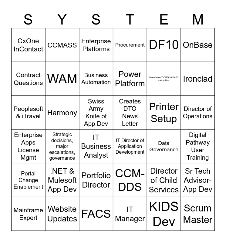 This bingo card has 50 words: Fleet Reservation System, Peoplesoft & iTravel, SNAP Fraud Prevention Tools, Data Governance, Printer Setup, Website Updates, CCMASS, KIDS Application, OnBase, FACS, Contract Questions, Procurement, Strategic decisions, major escalations, governance, Enterprise Apps License Mgmt, Mainframe Upgrades, CCM-DDS, WAM, Harmony, AVA Application, DF10, Ironclad, Digital Pathway User Training, CxOne InContact, Business Automation, Network Circuits & Phones, Portal Change Enablement, Power Platform, Adobe, Enterprise Platforms, Director of Operations, Director of Enterprise & Shared Services, Director of Child Services, Director of Admin Services, Director of Adult Services, IT Director of Application Development, Portfolio Director, IT Manager, KIDS Dev, Scrum Master, Swiss Army Knife of App Dev, Mainframe Expert, OKDHS Live App Dev, Sr Tech Advisor-App Dev, CWIS, IT Business Analyst, Mainframe/COBOL/AS400 – App Dev, .NET & Mulesoft App Dev, .Net/SQL – App Dev, Creates DTO News Letter and Booking Conference Rooms & travel.