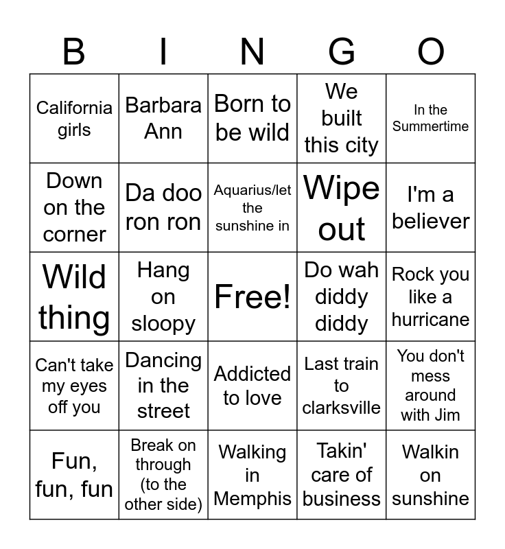 This bingo card has a free space and 33 words: The locomotion, Good vibrations, Hang on sloopy, Sugar, sugar, Can't take my eyes off you, Da doo ron ron, In the Summertime, Fun, fun, fun, Barbara Ann, Mellow yellow, Aquarius/let the sunshine in, Born to be wild, It's not unusual, I'm into something good, Do wah diddy diddy, I'm a believer, Break on through (to the other side), Wild thing, Dancing in the street, Last train to clarksville, Addicted to love, Hotel california, California girls, Rock you like a hurricane, Walking in Memphis, Walkin on sunshine, We built this city, Wipe out, Down on the corner, You don't mess around with Jim, Fly like an Eagle, Takin' care of business and Jack & Diane.