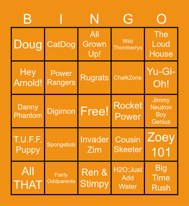 This bingo card has a free space and 24 words: Spongebob, Fairly Oddparents, Rugrats, All THAT, The Loud House, Doug, Hey Arnold!, CatDog, Rocket Power, Invader Zim, ChalkZone, Danny Phantom, Cousin Skeeter, Zoey 101, Power Rangers, H2O:Just Add Water, Jimmy Neutron Boy Genius, All Grown Up!, Yu-Gi-Oh!, Digimon, Big Time Rush, T.U.F.F. Puppy, Wild Thornberrys and Ren & Stimpy.