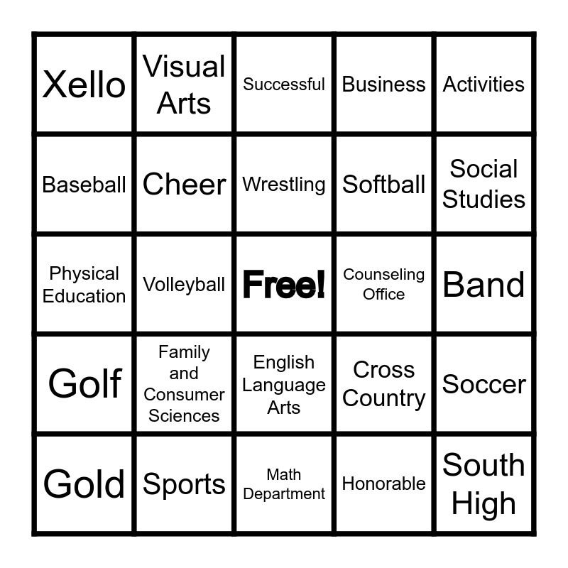 This bingo card has a free space and 43 words: Cougars, South High, Green, Gold, Safe, Honorable, Successful, Clubs, Activities, Sports, Business, Counseling Office, English Language Arts, Family and Consumer Sciences, Industrial Arts, Math Department, Performing Arts, Physical Education, Science, Social Studies, Visual Arts, World Languages, Main Office, Xello, Skyward, Band, Student Council, Drama Club, Cross Country, Golf, Football, Soccer, Tennis, Volleyball, Basketball, Bowling, Swimming & Diving, Wrestling, Baseball, Softball, Track and Field, Cheer and Dance.