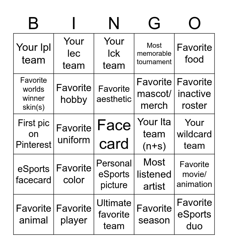 This bingo card has a free space and 24 words: Favorite animal, Favorite color, Favorite aesthetic, Favorite season, Favorite food, Your lpl team, Your lec team, Your lck team, Your lta team (n+s), Your wildcard team, First pic on Pinterest, Favorite hobby, Most listened artist, Favorite movie/ animation, Favorite worlds winner skin(s), Favorite player, Ultimate favorite team, Most memorable tournament, Favorite inactive roster, eSports facecard, Favorite uniform, Personal eSports picture, Favorite mascot/ merch and Favorite eSports duo.