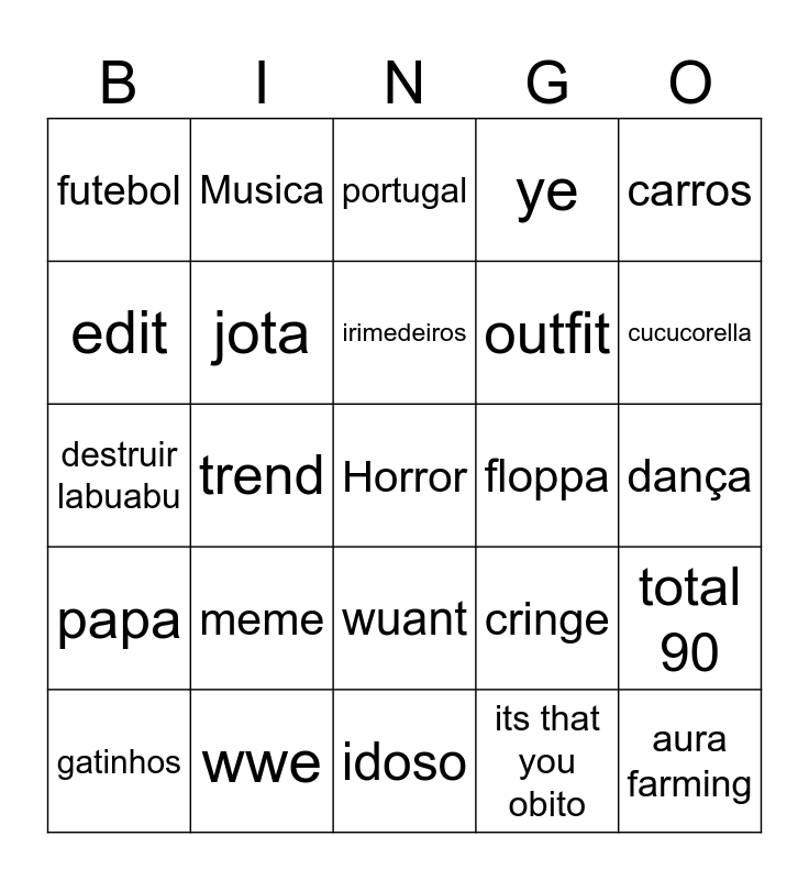 This bingo card has a free space and 24 words: meme, wwe, irimedeiros, gatinhos, carros, futebol, edit, Musica, floppa, wuant, outfit, destruir labuabu, cringe, total 90, jota, its that you obito, dança, portugal, cucucorella, trend, aura farming, papa, ye and idoso.