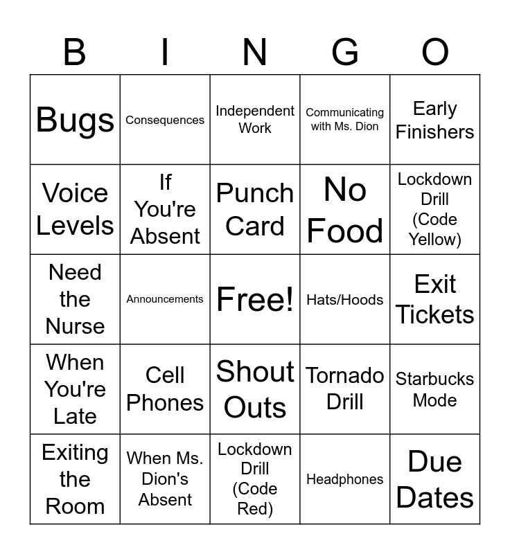 This bingo card has a free space and 40 words: Need the Restroom, Need the Nurse, Turning in Work, If You're Absent, When Ms. Dion's Absent, Shout Outs, Punch Card, Agendas, Early Finishers, When You're Late, Announcements, Communicating with Ms. Dion, Due Dates, Exit Tickets, Hats/Hoods, Cell Phones, Backpacks, Bugs, Name & Date, Independent Work, Starbucks Mode, Headphones, No Food, Voice Levels, One-on-One Time, When I'm Teaching, Need a Tissue, Need a Pencil, Entering the Room, Beginning of Class, Table Materials, Exiting the Room, Fire Drill, Tornado Drill, Lockdown Drill (Code Yellow), Lockdown Drill (Code Red), When I'm Teaching, Charging Computers, Consequences and Water Bottles.