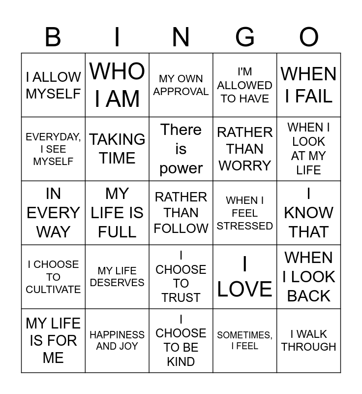 This bingo card has a free space and 24 words: MY LIFE DESERVES, HAPPINESS AND JOY, There is power, MY LIFE IS FOR ME, WHEN I FAIL, I ALLOW MYSELF, EVERYDAY, I SEE MYSELF, WHO I AM, WHEN I FEEL STRESSED, I CHOOSE TO TRUST, RATHER THAN WORRY, IN EVERY WAY, I LOVE, WHEN I LOOK BACK, TAKING TIME, SOMETIMES, I FEEL, I KNOW THAT, MY OWN APPROVAL, WHEN I LOOK AT MY LIFE, MY LIFE IS FULL, I WALK THROUGH, I CHOOSE TO CULTIVATE, I'M ALLOWED TO HAVE and I CHOOSE TO BE KIND.