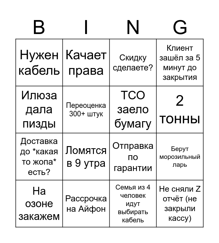 This bingo card has 16 words: Рассрочка на Айфон, Берут морозильный ларь, Скидку сделаете?, Нужен кабель, Доставка до *какая то жопа* есть?, Качает права, Отправка по гарантии, Семья из 4 человек идут выбирать кабель, Илюза дала пизды, Переоценка 300+ штук, На озоне закажем, Клиент зашёл за 5 минут до закрытия, Ломятся в 9 утра, 2 тонны, ТСО заело бумагу and Не сняли Z отчёт (не закрыли кассу).
