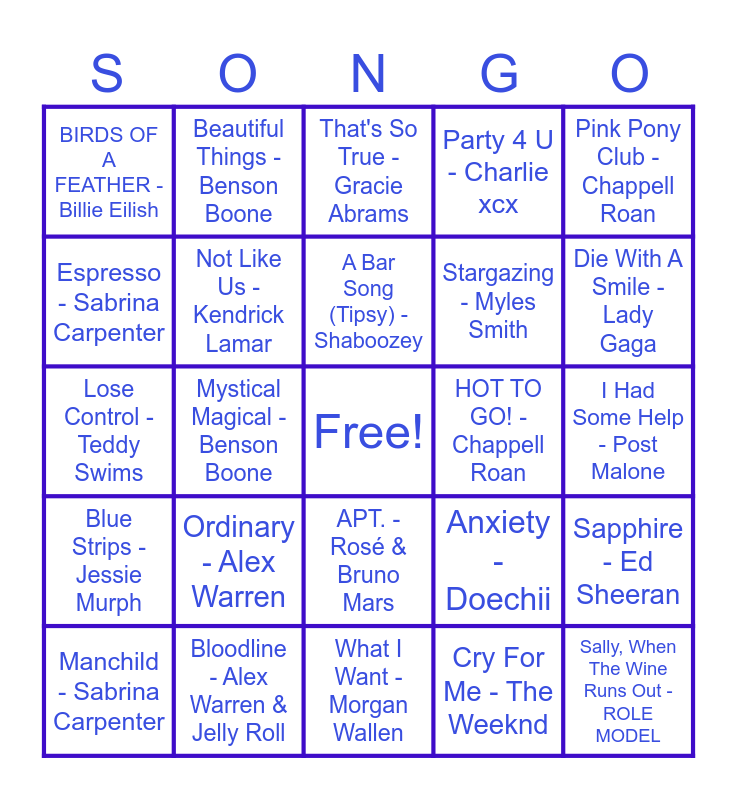 This bingo card has a free space and 25 words: Ordinary - Alex Warren, What I Want - Morgan Wallen, A Bar Song (Tipsy) - Shaboozey, Manchild - Sabrina Carpenter, Pink Pony Club - Chappell Roan, BIRDS OF A FEATHER - Billie Eilish, Espresso - Sabrina Carpenter, Beautiful Things - Benson Boone, HOT TO GO! - Chappell Roan, APT. - Rosé & Bruno Mars, Stargazing - Myles Smith, Lose Control - Teddy Swims, Anxiety - Doechii, Sapphire - Ed Sheeran, Not Like Us - Kendrick Lamar, NOKIA - Drake, I Had Some Help - Post Malone, That's So True - Gracie Abrams, Die With A Smile - Lady Gaga, Mystical Magical - Benson Boone, Sally, When The Wine Runs Out - ROLE MODEL, Bloodline - Alex Warren & Jelly Roll, Blue Strips - Jessie Murph, Party 4 U - Charlie xcx and Cry For Me - The Weeknd.