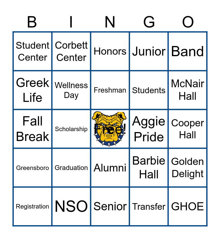 This bingo card has a free space and 27 words: Registration, NSO, Freshman, Transfer, McNair Hall, Student Center, Corbett Center, Alumni, Students, GHOE, Fall Break, Wellness Day, Exams, Barbie Hall, Cooper Hall, Aggie Four, Scholarship, Honors, Aggie Pride, Band, Greensboro, Graduation, Senior, Junior, Golden Delight, Greek Life and Sports.