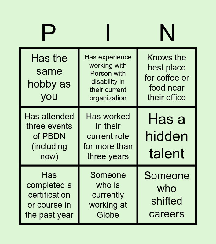 This bingo card has a free space and 8 words: Has attended three events of PBDN (including now), Has experience working with Person with disability in their current organization, Has a hidden talent, Has completed a certification or course in the past year, Knows the best place for coffee or food near their office, Has the same hobby as you, Someone who is currently working at Globe and Someone who shifted careers.