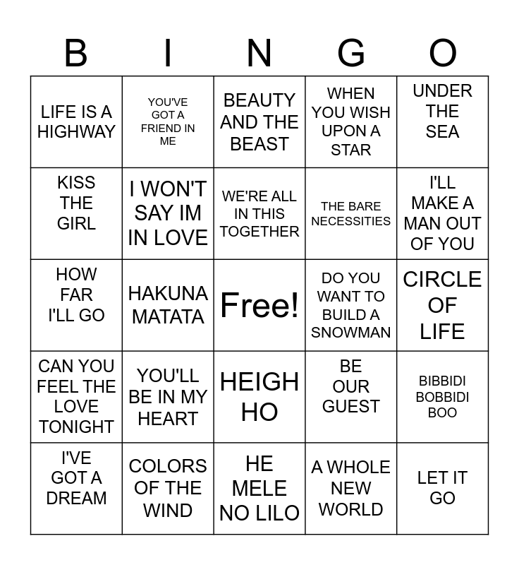 This bingo card has a free space and 24 words: YOU'LL BE IN MY HEART, COLORS OF THE WIND, WE'RE ALL IN THIS TOGETHER, I'VE GOT A DREAM, UNDER THE SEA, LIFE IS A HIGHWAY, KISS THE GIRL, YOU'VE GOT A FRIEND IN ME, DO YOU WANT TO BUILD A SNOWMAN, HEIGH HO, THE BARE NECESSITIES, HOW FAR I'LL GO, BE OUR GUEST, BIBBIDI BOBBIDI BOO, I WON'T SAY IM IN LOVE, A WHOLE NEW WORLD, CIRCLE OF LIFE, BEAUTY AND THE BEAST, I'LL MAKE A MAN OUT OF YOU, HAKUNA MATATA, LET IT GO, CAN YOU FEEL THE LOVE TONIGHT, WHEN YOU WISH UPON A STAR and HE MELE NO LILO.