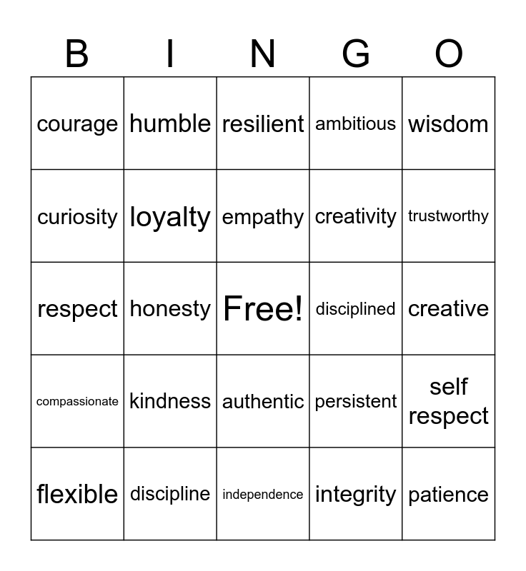 This bingo card has a free space and 24 words: kindness, discipline, empathy, flexible, wisdom, courage, curiosity, humble, disciplined, authentic, creativity, respect, persistent, self respect, loyalty, integrity, creative, resilient, trustworthy, honesty, patience, compassionate, ambitious and independence.