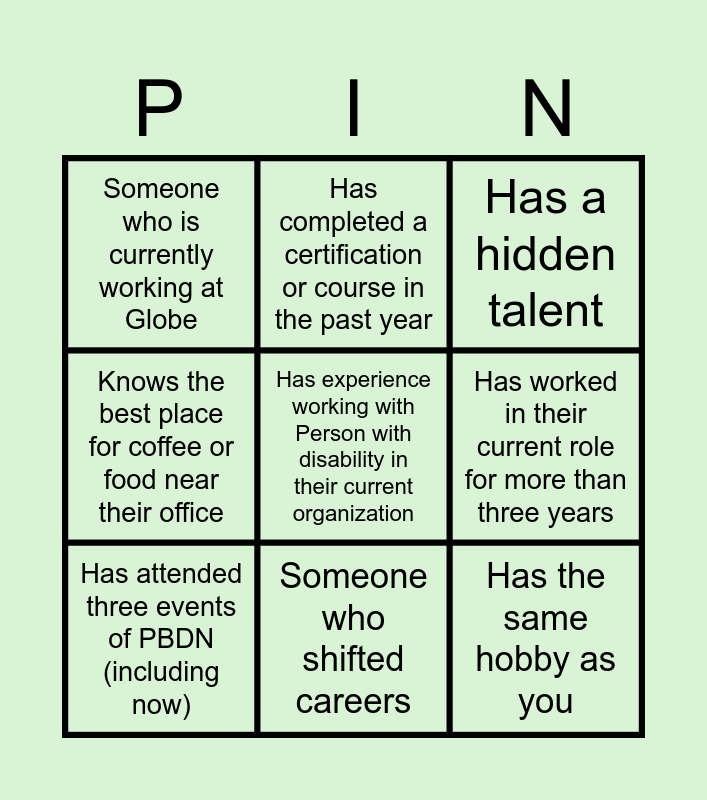 This bingo card has a free space and 8 words: Knows the best place for coffee or food near their office, Has completed a certification or course in the past year, Has worked in their current role for more than three years, Has attended three events of PBDN (including now), Has a hidden talent, Someone who is currently working at Globe, Someone who shifted careers and Has the same hobby as you.