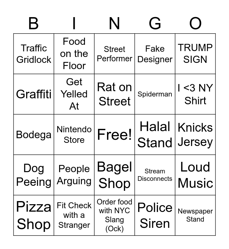 This bingo card has a free space and 24 words: Pizza Shop, People Arguing, Rat on Street, Police Siren, TRUMP SIGN, Traffic Gridlock, Food on the Floor, Street Performer, Halal Stand, Knicks Jersey, Bodega, Get Yelled At, Stream Disconnects, Loud Music, Graffiti, Fit Check with a Stranger, Order food with NYC Slang (Ock), Fake Designer, I <3 NY Shirt, Dog Peeing, Nintendo Store, Bagel Shop, Spiderman and Newspaper Stand.