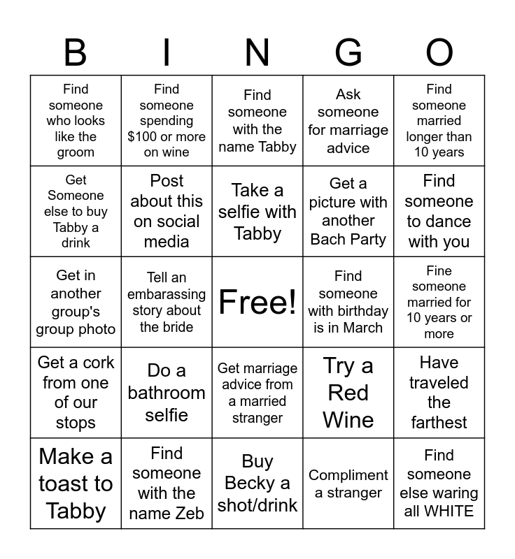 This bingo card has a free space and 27 words: Try a Red Wine, Try a White Wine, Get a picture with another Bach Party, Buy Becky a shot/drink, Get Someone else to buy Tabby a drink, Find someone with the name Tabby, Find someone spending $100 or more on wine, Get a cork from one of our stops, Find someone with birthday is in March, Have traveled the farthest, Get in another group's group photo, Ask someone for marriage advice, Make a toast to Tabby, Find someone with the name Zeb, Find someone to dance with you, Dance by yourself, Post about this on social media, Take a selfie with Tabby, Do a bathroom selfie, Find someone who looks like the groom, Fine someone married for 10 years or more, Compliment a stranger, Tell an embarassing story about the bride, Find someone else waring all WHITE, Get marriage advice from a married stranger, Find someone married longer than 10 years and Find someone wearing blue.