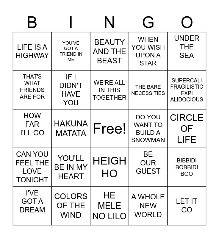 This bingo card has a free space and 24 words: YOU'LL BE IN MY HEART, COLORS OF THE WIND, WE'RE ALL IN THIS TOGETHER, I'VE GOT A DREAM, UNDER THE SEA, LIFE IS A HIGHWAY, THAT'S WHAT FRIENDS ARE FOR, YOU'VE GOT A FRIEND IN ME, DO YOU WANT TO BUILD A SNOWMAN, HEIGH HO, THE BARE NECESSITIES, HOW FAR I'LL GO, BE OUR GUEST, BIBBIDI BOBBIDI BOO, IF I DIDN'T HAVE YOU, A WHOLE NEW WORLD, CIRCLE OF LIFE, BEAUTY AND THE BEAST, SUPERCALI FRAGILISTIC EXPI ALIDOCIOUS, HAKUNA MATATA, LET IT GO, CAN YOU FEEL THE LOVE TONIGHT, WHEN YOU WISH UPON A STAR and HE MELE NO LILO.