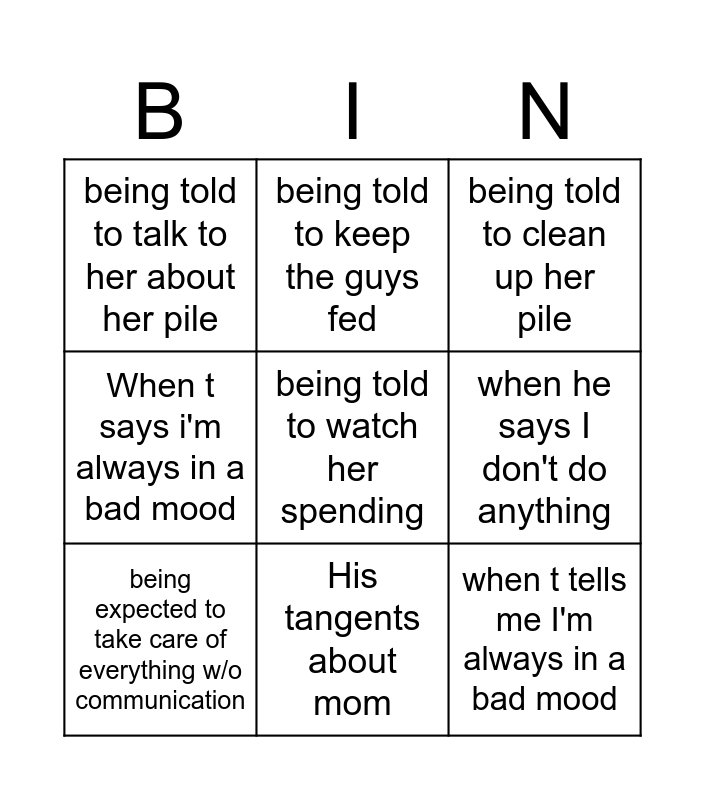 This bingo card has 10 words: His tangents about mom, being told to clean up her pile, being told to talk to her about her pile, being told to watch her spending, When t says i'm always in a bad mood, being expected to take care of everything w/o communication, being told to keep the guys fed, having to watch his dog for hours w/o communication, when he says I don't do anything and when t tells me I'm always in a bad mood.