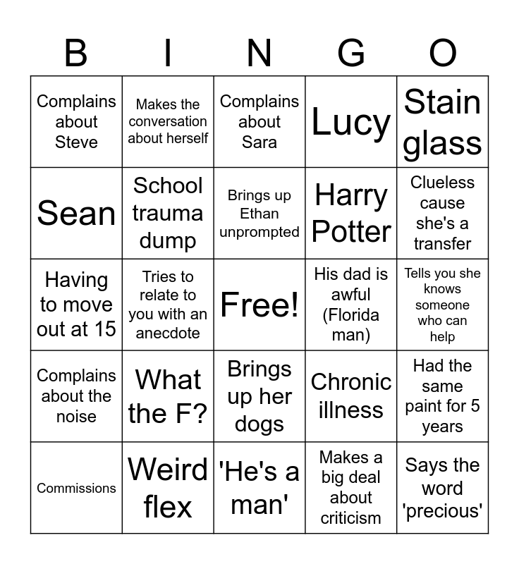 This bingo card has a free space and 24 words: What the F?, Weird flex, Brings up Ethan unprompted, Commissions, Stain glass, Complains about Steve, Sean, Makes the conversation about herself, His dad is awful (Florida man), Brings up her dogs, Harry Potter, Having to move out at 15, Chronic illness, Had the same paint for 5 years, School trauma dump, Makes a big deal about criticism, Tells you she knows someone who can help, Complains about Sara, Clueless cause she's a transfer, Tries to relate to you with an anecdote, Says the word 'precious', Complains about the noise, Lucy and 'He's a man'.