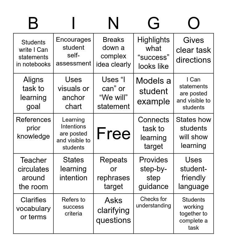 This bingo card has a free space and 24 words: States learning intention, Refers to success criteria, Uses “I can” or “We will” statement, Clarifies vocabulary or terms, Gives clear task directions, Students write I Can statements in notebooks, Aligns task to learning goal, Encourages student self-assessment, Connects task to learning target, Repeats or rephrases target, Models a student example, References prior knowledge, Provides step-by-step guidance, Uses student-friendly language, Uses visuals or anchor chart, Checks for understanding, States how students will show learning, Breaks down a complex idea clearly, I Can statements are posted and visible to students, Learning Intentions are posted and visible to students, Students working together to complete a task, Teacher circulates around the room, Highlights what “success” looks like and Asks clarifying questions.