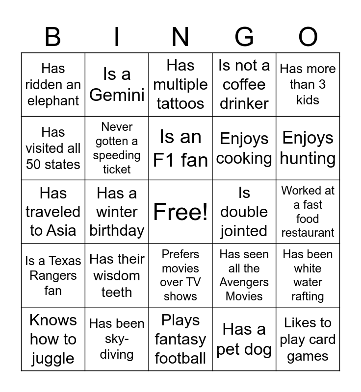 This bingo card has a free space and 24 words: Has their wisdom teeth, Has been sky-diving, Is an F1 fan, Knows how to juggle, Has more than 3 kids, Has ridden an elephant, Has visited all 50 states, Is a Gemini, Is double jointed, Prefers movies over TV shows, Enjoys cooking, Has traveled to Asia, Has seen all the Avengers Movies, Has been white water rafting, Never gotten a speeding ticket, Has a pet dog, Worked at a fast food restaurant, Has multiple tattoos, Enjoys hunting, Has a winter birthday, Likes to play card games, Is a Texas Rangers fan, Is not a coffee drinker and Plays fantasy football.