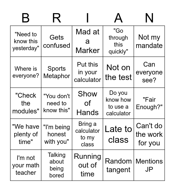 This bingo card has a free space and 29 words: I'm not your math teacher, "I don't want to go over this", "You don't need to know this", Reinventing the wheel, "Need to know this yesterday", Mad at a Marker, Sports Metaphor, "I'm being honest with you", Do you know how to use a calculator, Talking about being bored, "Fair Enough?", Mentions JP, Running out of time, Random tangent, Can everyone see?, Talking about wasting time, Bring a calculator to my class, "We have plenty of time", Not my mandate, "Check the modules", Late to class, "Two birds with one stone", Not on the test, Where is everyone?, "Go through this quickly", Gets confused, Can't do the work for you, Put this in your calculator and "Who can relate to that?".