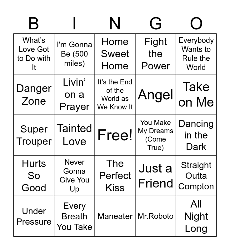 This bingo card has a free space and 54 words: Keep on Loving You, Hurts So Good, I Still Haven’t Found What I’m Looking For, Working for the Weekend, The Perfect Kiss, Express Yourself, Fight the Power, Don’t Stop Believin’, Danger Zone, Africa, What’s Love Got to Do with It, Down Under, Every Breath You Take, Under Pressure, Time After Time, Maneater, All Night Long, Angel, Sexual Healing, Dancing in the Dark, Just a Friend, Come on Eileen, You Make My Dreams (Come True), Everybody Wants to Rule the World, Should I Stay or Should I Go, I'm Gonna Be (500 miles), Wind Beneath My Wings, Love Shack, We’re Not Gonna Take It, Mr.Roboto, Hangin’ Tough, Purple Rain, Rock You Like a Hurricane, Darlington County, Home Sweet Home, Lay All Your Love on Me, Super Trouper, Straight Outta Compton, Physical, Livin’ on a Prayer, Eye of the Tiger, Jump, Waiting on a Friend, Pour Some Sugar on Me, Never Gonna Give You Up, Super Freak, Karma Chameleon, Don’t You (Forget About Me), It’s the End of the World as We Know It, Tainted Love, Take on Me, I Want to Know What Love Is, Nothing's Gonna Stop Us Now and Forever Young.