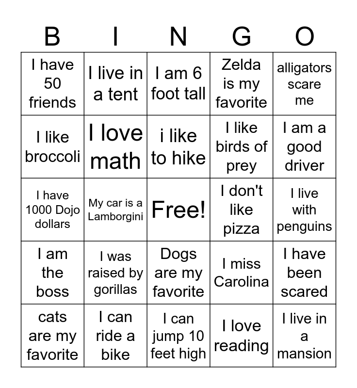 This bingo card has a free space and 24 words: I was raised by gorillas, I can ride a bike, i like to hike, cats are my favorite, alligators scare me, I have 50 friends, I like broccoli, I live in a tent, I don't like pizza, Dogs are my favorite, I like birds of prey, I have 1000 Dojo dollars, I miss Carolina, I have been scared, I love math, I love reading, I live with penguins, I am 6 foot tall, I am a good driver, My car is a Lamborgini, I live in a mansion, I am the boss, Zelda is my favorite and I can jump 10 feet high.